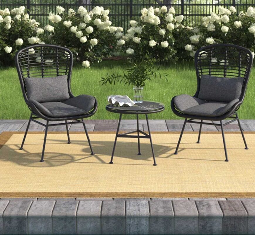 كراسي حديقة رتان أسود مع طقم ترابيزة وقماش رمادي غامق