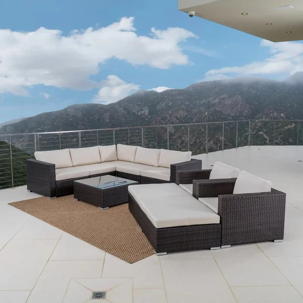 جلسات حدائق خارجية رتان بني رمادي بتصميم مودرن | أثاث خارجي فاخر
