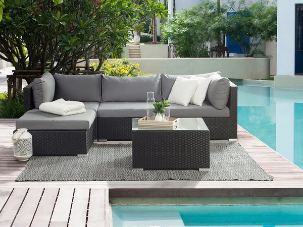 جلسات خارجية للمنازل من اثاث خارجي رتان فيراني وقماش رمادي أنيق