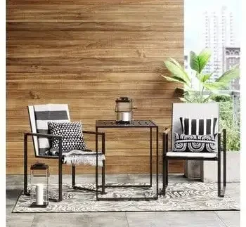 طقم كراسي بلكونة عملي وأنيق، مصنوع من معدن مقاوم للصدأ مع قماش واتر بروف ومزود بخدديات مريحة، مثالي للبلكونات والمساحات الخارجية الصغيرة.