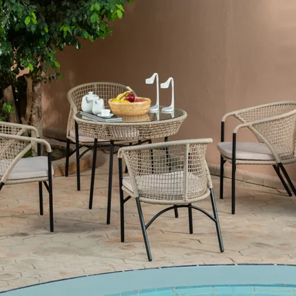طقم كراسي حدائق بتصميم عصري مكون من 4 كراسي وترابيزة دائرية، مصنوع من خامات مقاومة للعوامل الخارجية، مثالي لاختيار أثاث خارجي يدوم لسنوات.