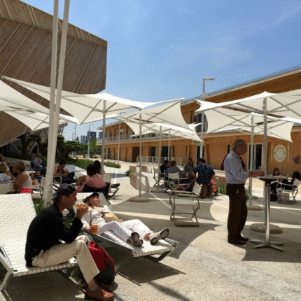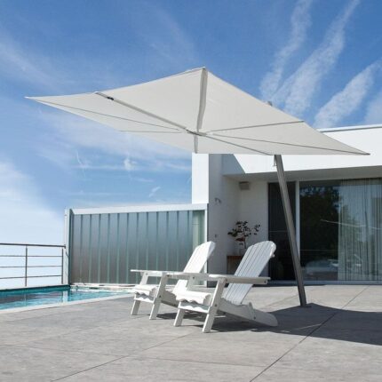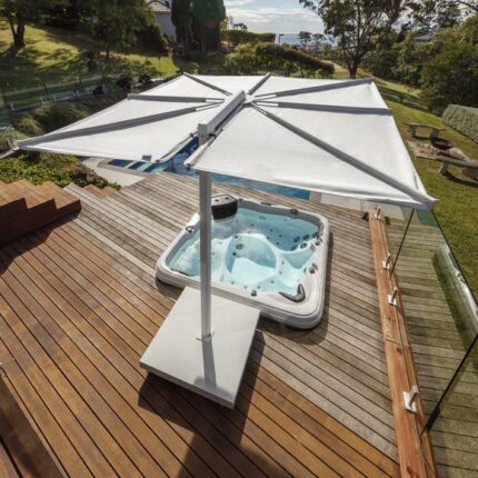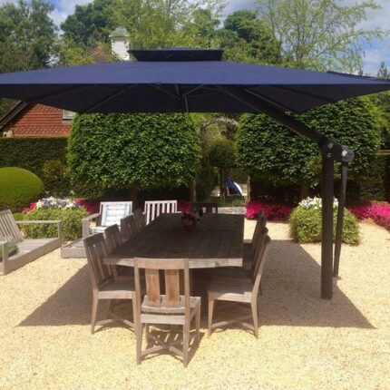 مظلات شمسية 4×4 متر فولاذية متينة، دوران 360°، جلد ألماني أو قماش تركي مقاوم للماء، مناسبة للحدائق والكافيهات والفيلات.