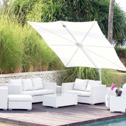 مظلات للشمس 3×3 متر فولاذية متينة، دوران 360°، جلد ألماني أو قماش تركي مقاوم للماء، مناسبة للحدائق والكافيهات والفيلات.