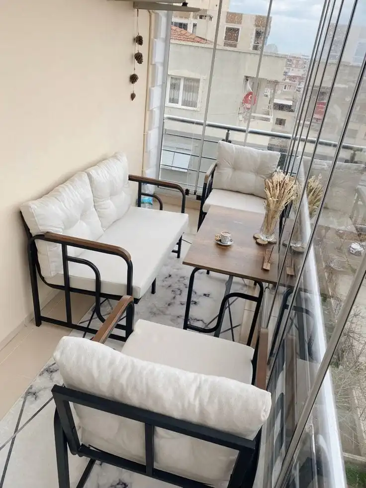 كراسي بلكونة طقم جلوس معدني مع لمسات خشبية وأريكة مريحة