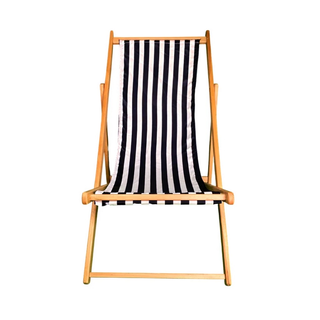 كرسي بحر من خشب الزان مصمم باللونين الأسود والأبيض، يجمع بين المتانة والراحة ليكون مناسبًا للاستخدام الخارجي في الشواطئ والحدائق.