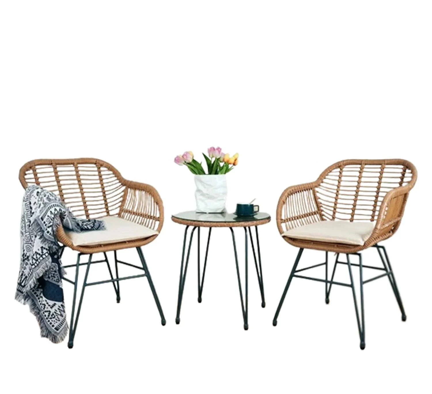 امنح حديقتك أو شرفتك لمسة من الأناقة والراحة مع طقم كراسي راتان عصري. يتضمن الطقم 2 كرسي وترابيزه من الرتان البيج المشبح مع قماش أوف وايت، مما يوفر تجربة جلوس فاخرة ومظهر متناسق لأي مساحة خارجية أو داخلية.