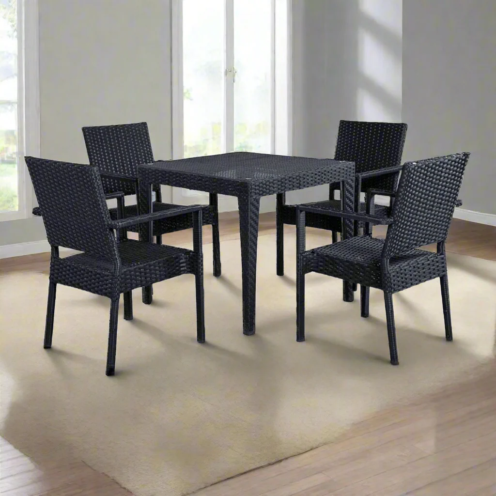 طقم كراسي سفرة رتان باللون الأسود مع ترابيزة زجاج يوفر تصميمًا عصريًا ومتينًا يناسب المساحات الخارجية ويجمع بين الراحة والجودة.
