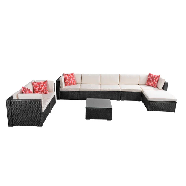 ويأتي الطقم بلون رتان أسود مع قماش طحيني يمنح مظهراً راقياً يناسب جميع المساحات الخارجية.
