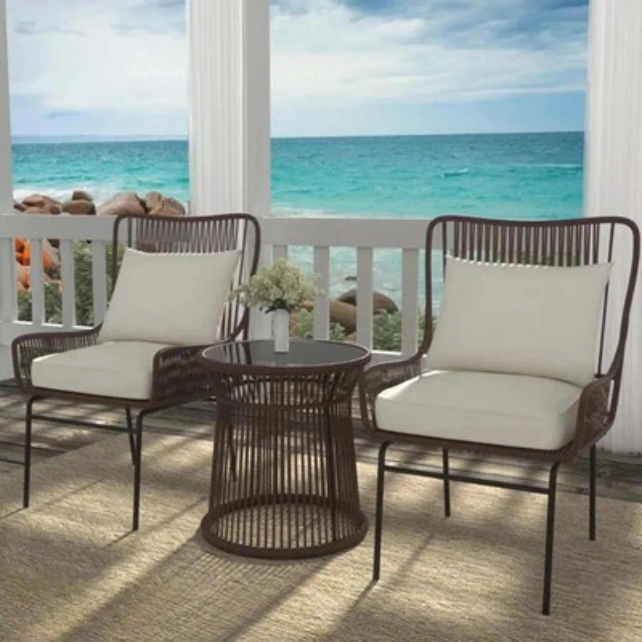 طقم كراسي بلكونة رتان بني مع قماش أوف وايت، تصميم عصري مقاوم للعوامل الجوية يوفر راحة وجمالاً فائقًا لأي بلكونة أو تراس.