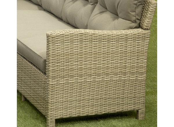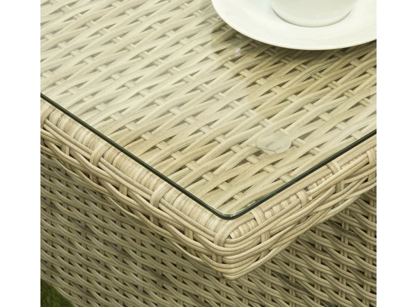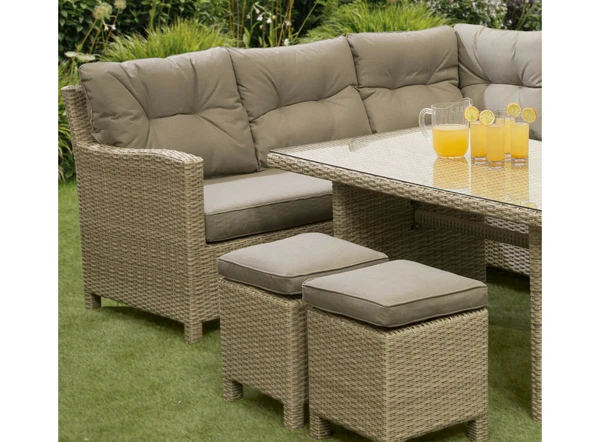 ركنة رتان كريمي فاخرة لجلسات خارجية للمنازل، مصنوعة من خامات مقاومة للشمس والصدأ لتمنحك أثاث خارجي يجمع بين الراحة والأناقة لسنوات طويلة.