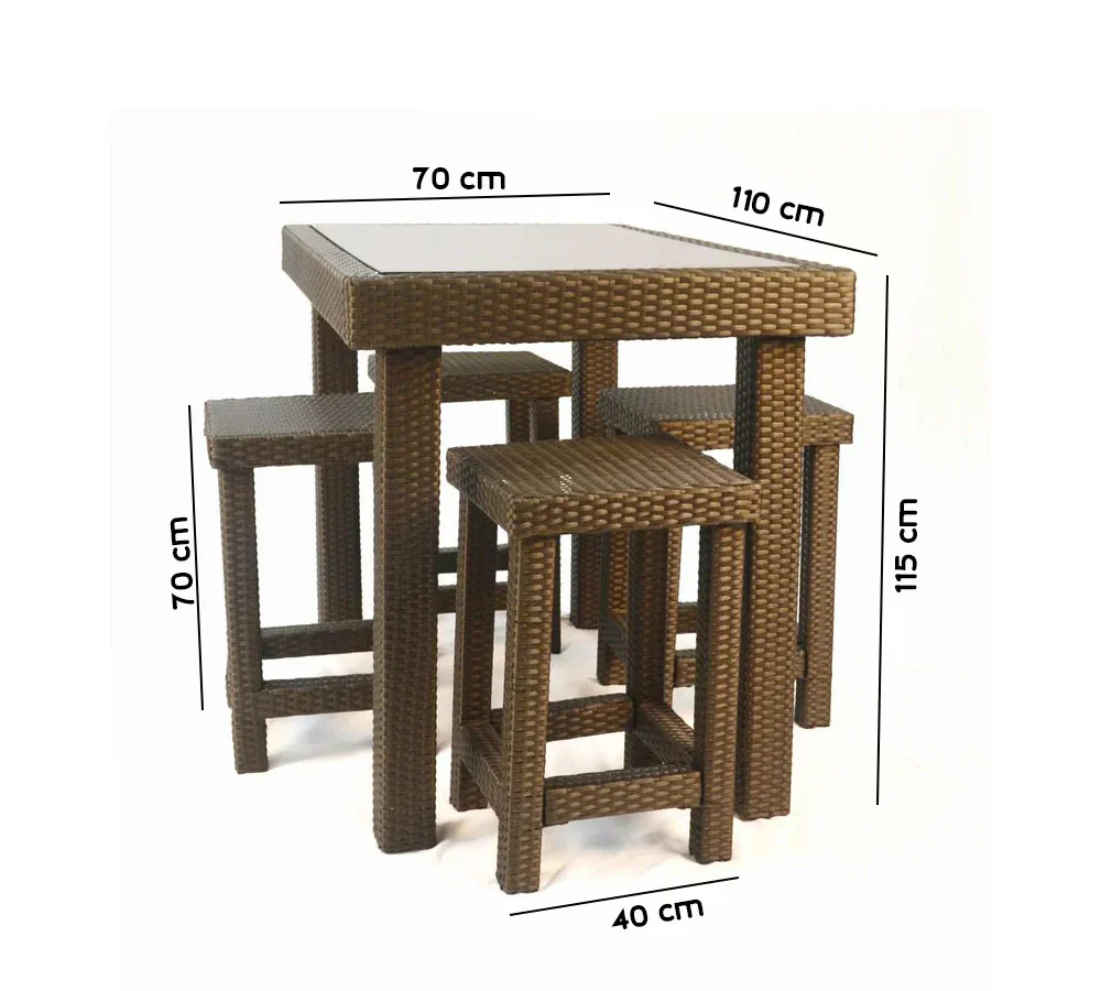يأتي كرسي البار بخامات قوية تجمع بين هيكل حديد بطلاء إليكتروستاتيك مقاوم للصدأ، مع رتان بيور معالج ليصمد أمام الشمس والمياه دون أن يتأثر لونه أو خامته. جودة الخامات تمنحه عمرًا طويلًا حتى مع الاستخدام المكثّف في الهواء الطلق.