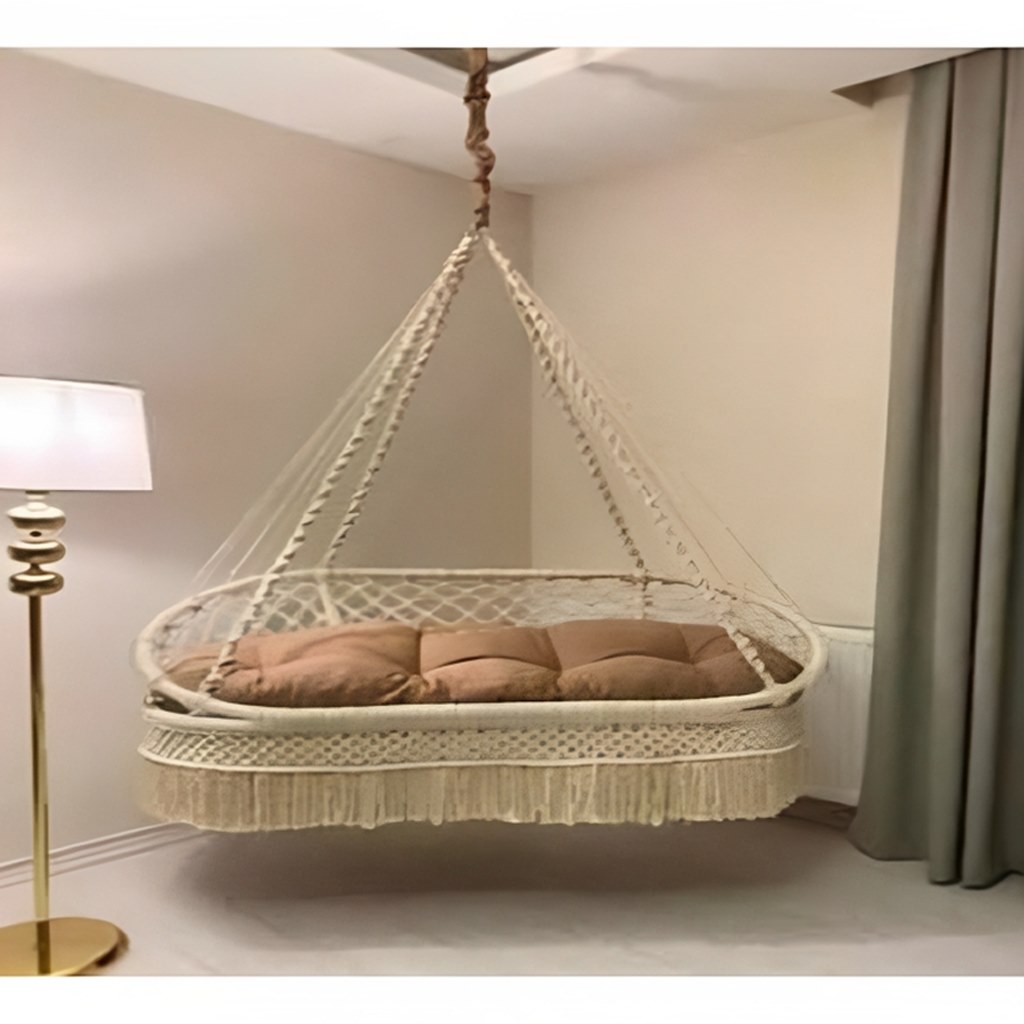 تتميز المرجيحة بتصميم مكرميه فني أنيق يمنحها لمسة بوهيمية عصرية تضيف جمالاً طبيعيًا لأي مساحة.