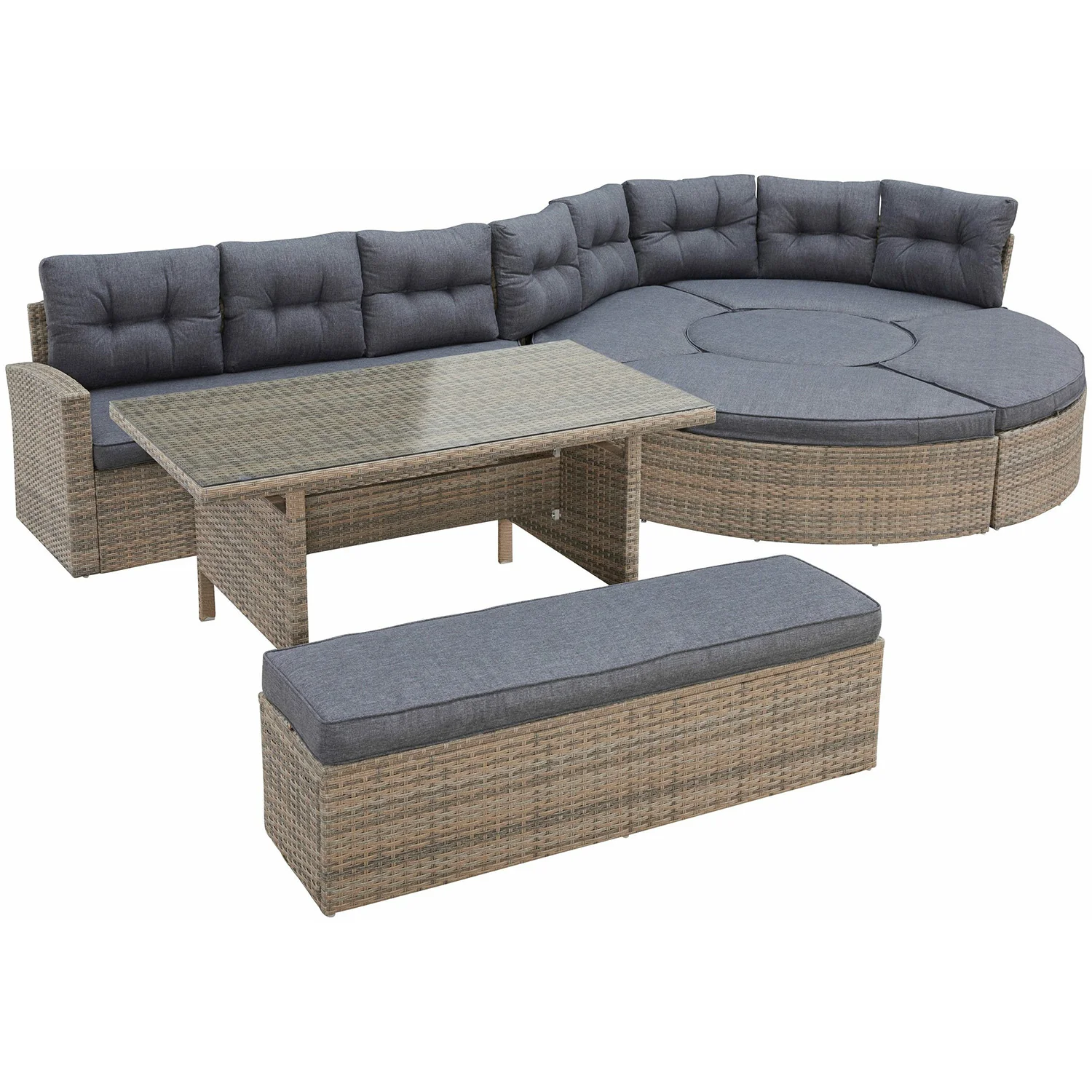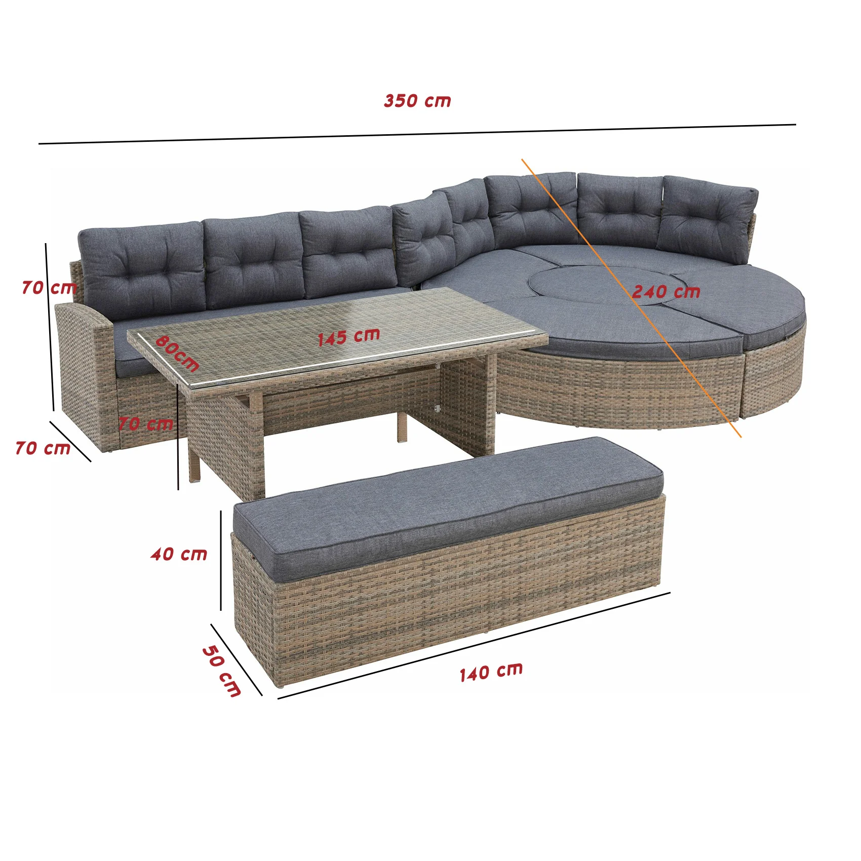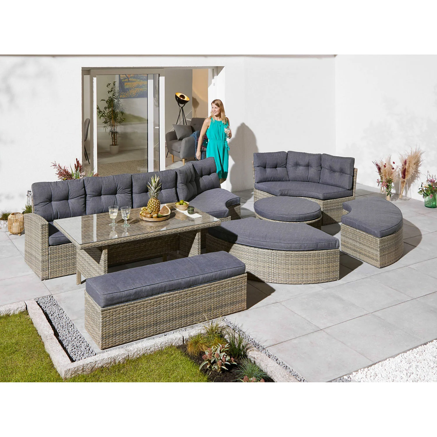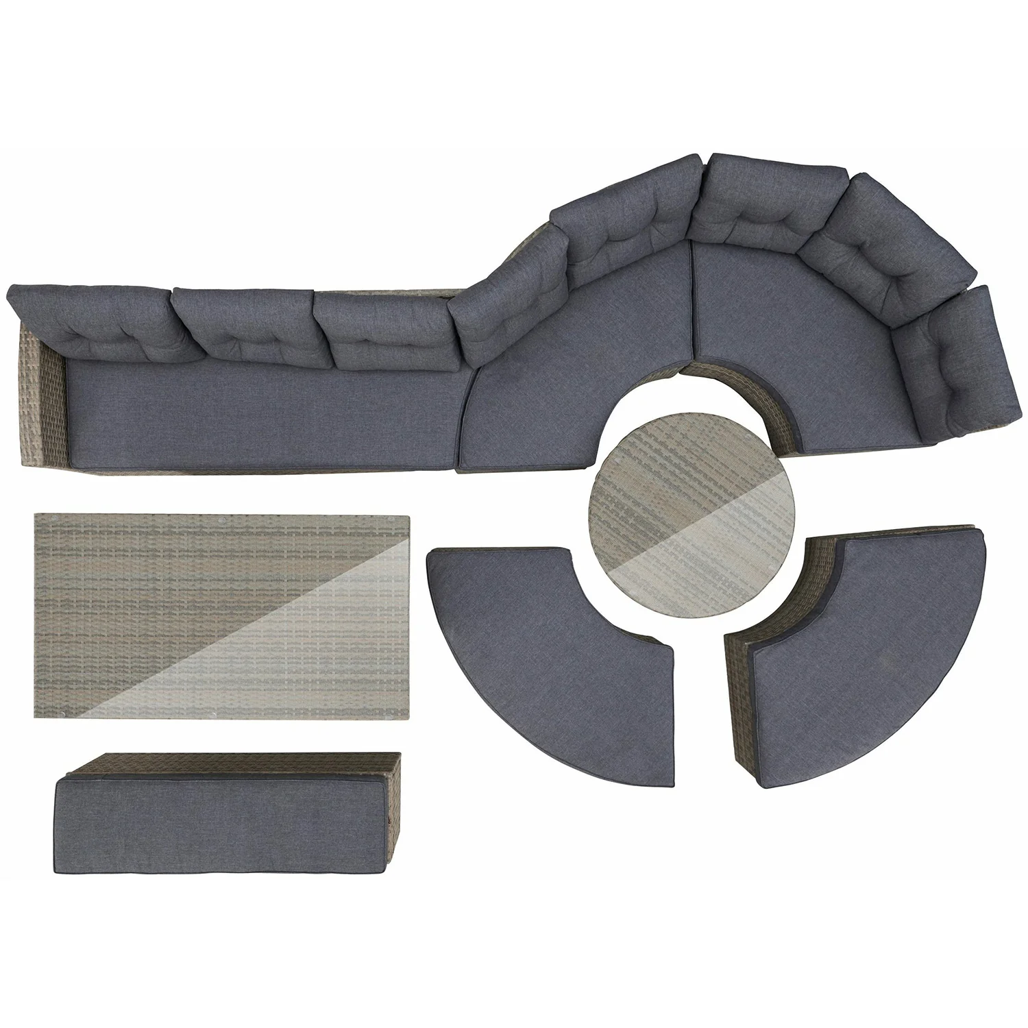 تصميم مودرن أنيق يتكون من كنبة 3 مقعد بكتف واحد، كنبة نصف راوند، كنبة راوند 2 مقعد بدون أكتاف، إضافة إلى بوفات مختلفة وأريكة متعددة الاستخدامات يمكن دمجها أو توزيعها حسب المساحة. يأتي الطقم بقماش رمادي غامق فاخر، بينما الرتان غير متوفر.
