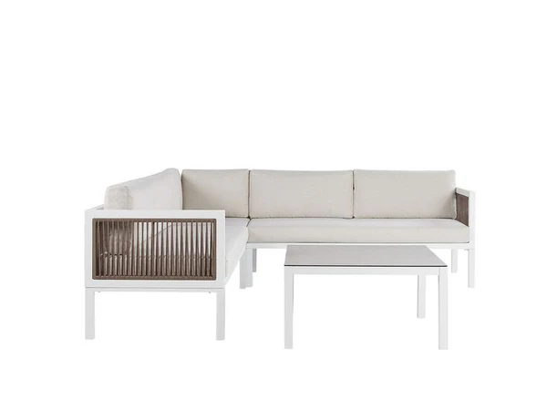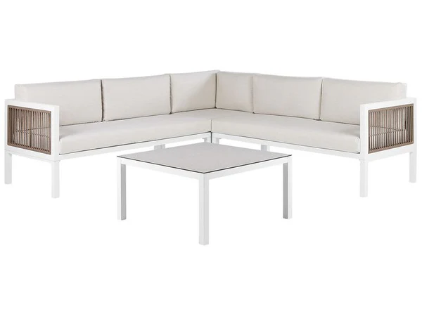جلسات خارجية بيج مع هيكل أبيض وطاولة جانبية، تصميم فاخر يجمع بين الراحة والمتانة ليضفي لمسة أنيقة على أي مساحة خارجية.