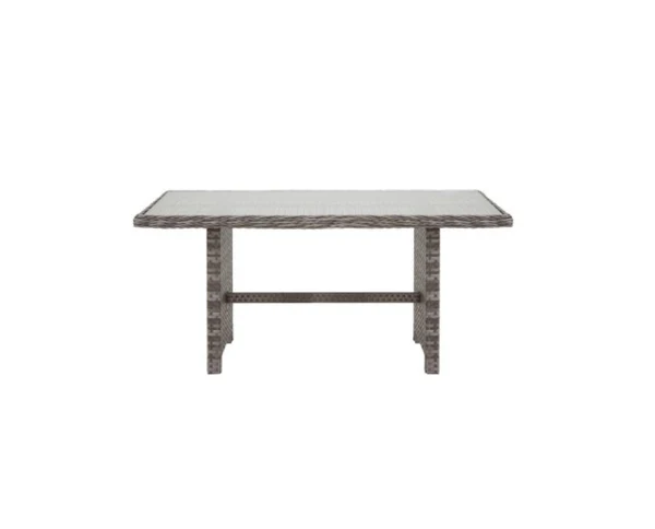 تصميم مودرن وفاخر مع رتان رمادي غامق في رمادي فاتح وقماش رمادي غامق، يتضمن 2 كنبة و2 بوف وطاولة عملية، مناسب للحدائق والتراسات والفناءات.