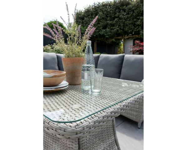 القماش المستخدم دك مقاوم للشمس مع سطح زجاجي شفاف 6 ملم للطاولة.