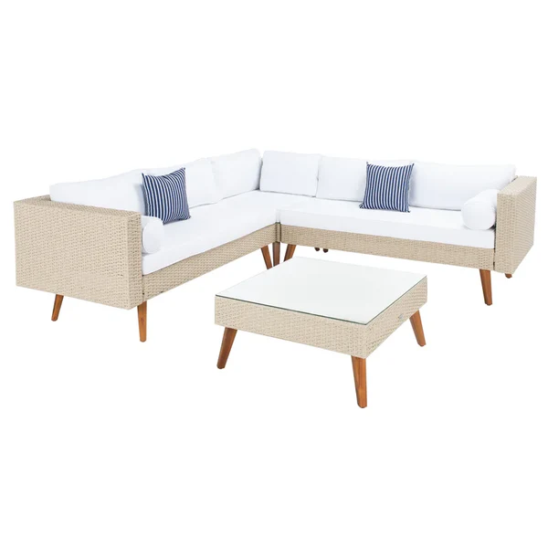 مصنوع من حديد دهان إليكتروستاتيك ضد الصدأ مع هيكل رتان كريمي فاتح معالج مقاوم للشمس والمياه. الطاولة مزودة بزجاج شفاف 6 مللي شطف كمبيوتر، والمقاعد مغطاة بقماش أوف وايت ووتربروف مستورد معالج ضد العوامل الجوية لضمان متانة طويلة الأمد.