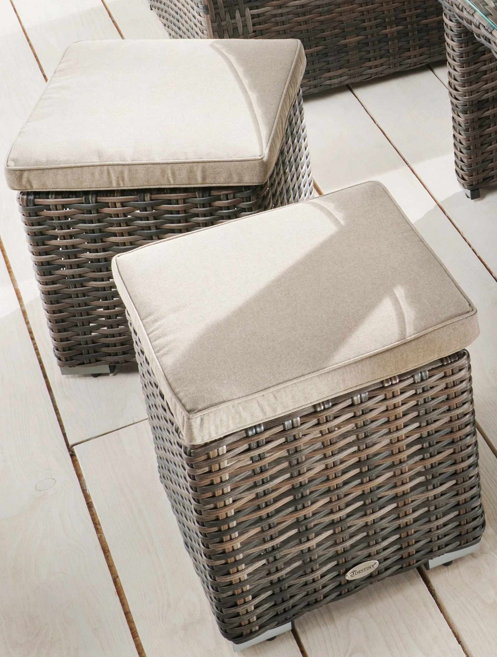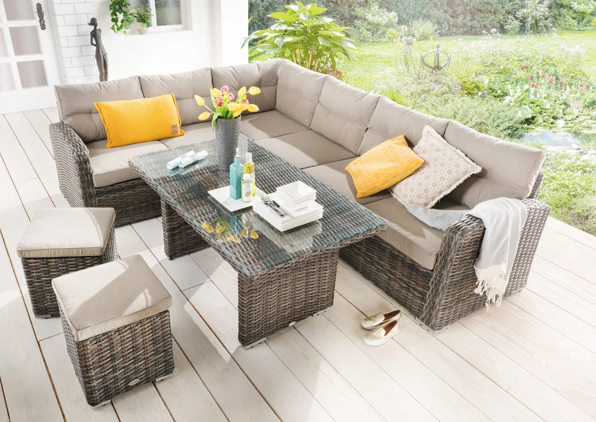 اصنع ركناً مريحاً في حديقتك أو تراسك مع هذا الطقم العصري من جلسات خارجية. يتكون الطقم من كنبة 3 مقعد، كنبة 3 مقعد بكتف واحد، بوفين وطاولة، حيث يمكن دمج المكونات أو استخدامها منفصلة لتوفير أقصى استفادة من المساحة، مع مساحة جانبية مثالية لوضع مشروبك.