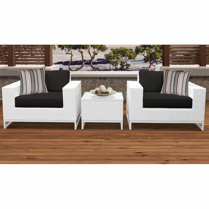 بتصميم مودرن أنيق، يأتي الطقم بلون رتان أبيض فاخر مع قماش أسود يمنح مظهرًا راقيًا يتناسب مع المساحات الخارجية العصرية. تصميمه المدمج يجعله مناسبًا جدًا للمساحات الصغيرة دون التنازل عن الراحة.