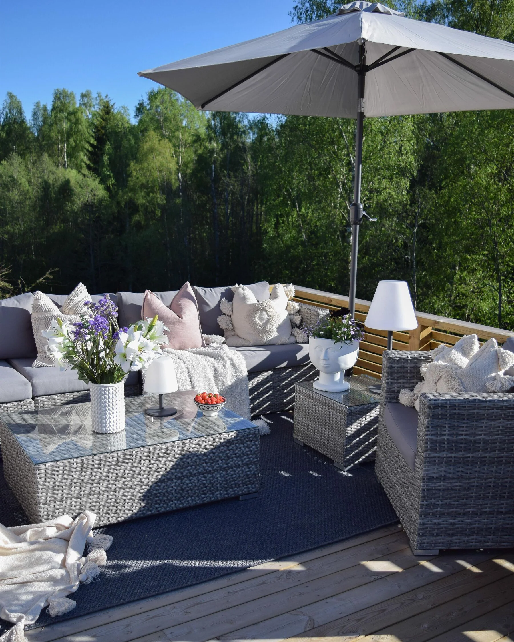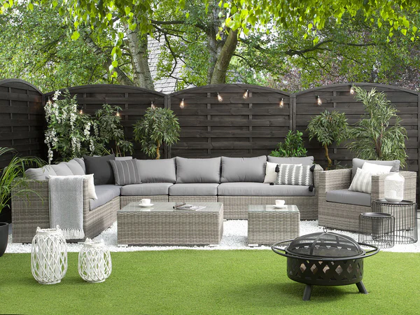 جلسات خارجية بتصميم رتان أبيض ورمادي تمنحك طقمًا متكاملًا يجمع الفخامة والمتانة، ليمنح مساحتك الخارجية إطلالة راقية ومريحة.