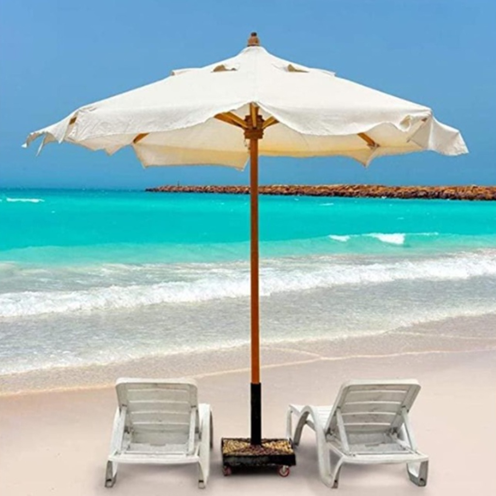 تأتي الشمسيّة بتصميم أنيق وعصري باللون الأوف وايت لتتناسب مع جميع أنماط الديكور الخارجي. كما أن ارتفاعها البالغ 290 سم مع قطر 3×3 متر يمنح تغطية واسعة ومثالية للمساحات الكبيرة سواء في الحدائق أو الشواطئ.