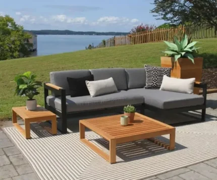 ركنه حديد أنيقة من طقم اثاث خارجي معدني باللون الأسود مع لمسات من الخشب الطبيعي، تصميم عصري وخامات فاخرة مقاومة للصدأ والماء، مثالية للحدائق والتراسات.
