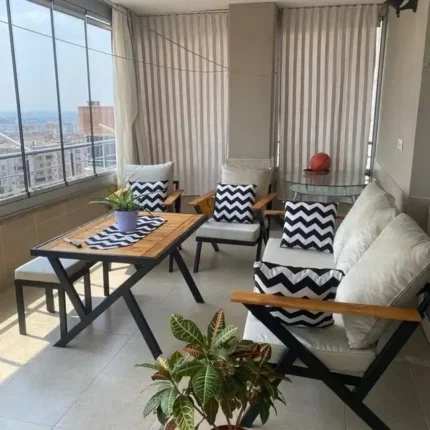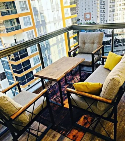 طقم كراسي بلكونة معدني مع لمسات خشبية ووسائد مريحة، يجمع بين الأناقة والراحة لجلسات فاخرة في الشرفات والبلكونات المغلقة.