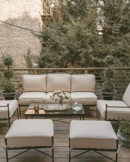 طقم كراسي بلكونة صوفا وكرسيين معدن مع ترابيزة، تصميم مودرن أنيق يوفر الراحة والفخامة لجلسات البلكونات والحدائق الخارجية.