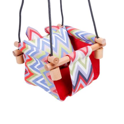 مرجيحه اطفال من خشب زان أحمر وقماش معالج متعددة الألوان، توفر الأمان والراحة بلمسة من المرح، مثالية لغرف الأطفال والحدائق المنزلية.