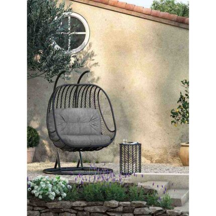 مرجيحه رتان سوداء بتصميم أنيق وخامة متينة من الراتان والمعدن مع فرش كتان فاخر يمنحك أقصى درجات الراحة. مثالية للحدائق والفيلات والشرفات الراقية.