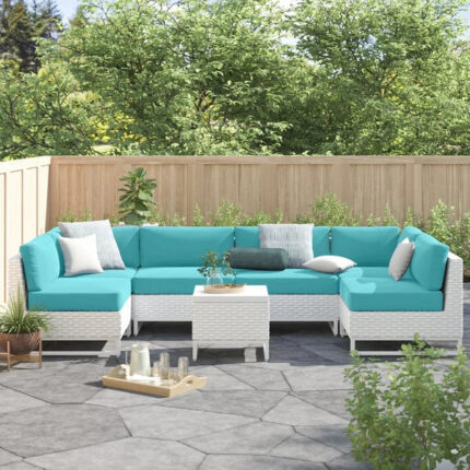 جلسات خارجية للمنازل بتصميم مودرن من الرتان الأبيض مع قماش تركواز، تمنحك ركنًا مريحًا وأنيقًا يناسب المساحات الخارجية الراقية.