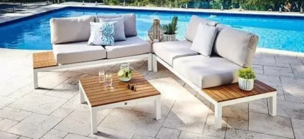 اكتشف روعة جلسات خارجية من ستيل أبيض وخشب موسكي طبيعي بتصميم مودرن فاخر ومتانة تدوم. مثالية للحدائق والمساحات المفتوحة الأنيقة.