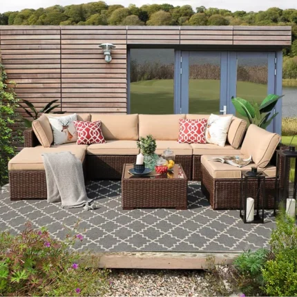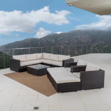 تمتع بجلسات خارجية للمنازل بتصميم بيج فاخر من الرتان البني، تجمع بين الأناقة العملية والمتانة لتجعل مساحتك الخارجية مثالية للراحة والاسترخاء.