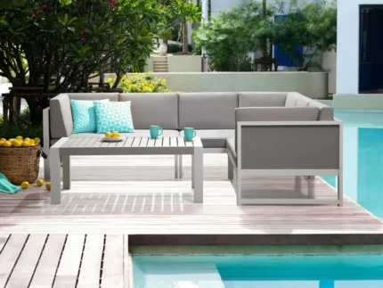 ركنة حديدية رمادي مثالية لجلسات خارجية للمنازل، تجمع بين التصميم العصري والخامات المقاومة للصدأ والشمس لتمنحك أثاث خارجي عملي وأنيق يدوم طويلًا.