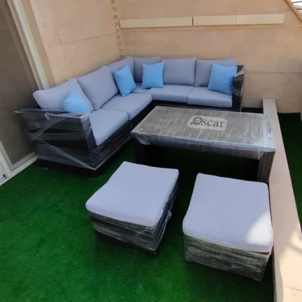 ركنة رتان أسود مثالية لجلسات خارجية للمنازل، تجمع بين الفخامة والراحة مع خامات متينة وتصميم عصري لأثاث خارجي يدوم طويلاً.
